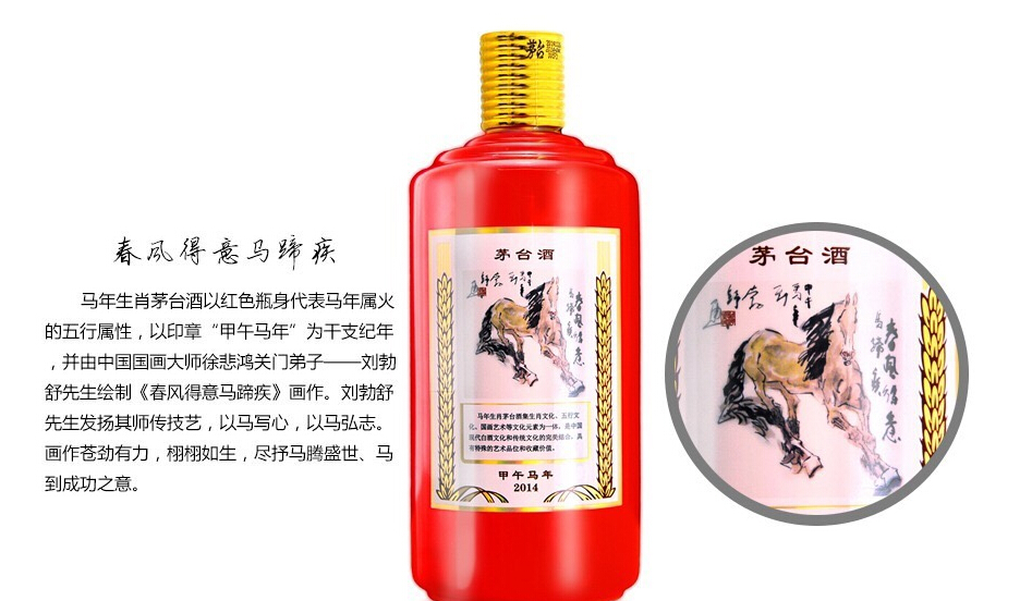 馬年生肖茅臺(tái)酒以紅色瓶身代表馬年屬火的五行屬性,以印章“甲午馬年”為干支紀(jì)年,并由中國(guó)國(guó)畫(huà)大師徐悲鴻關(guān)門(mén)弟子--劉勃舒先生繪制《春風(fēng)得意馬蹄疾》畫(huà)作。