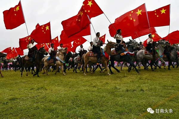 上午10時許,隨著高云龍宣布第二十屆九色甘南香巴拉旅游藝術節(jié)開幕,由千匹駿馬、千名騎手組成的馬隊如騰飛的巨龍一般從主席臺前飛馳而過,象征著偉大祖國從站起來、富起來到強起來光輝歷程的71面五星紅旗在會場迎風飄揚……