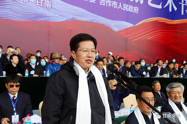 俞成輝在致辭中說,有一種天色叫“甘南藍”,無須望眼欲穿,夢想的翅膀就會自由飛旋;有一種底色叫“甘南綠”,無須濃墨重彩,信仰的曲線就會自然天成;有一種水色叫“甘南美”,無須詩情畫意,心靈的港灣就會碧波蕩漾;有一種月色叫“甘南情”,無須驀然回首,記憶的廊橋就會燈火闌珊;有一種音色叫“甘南韻”,無須曲高和寡,生命的天籟就會穿越云霄;有一種成色叫“甘南紅”,無須慷慨激昂,奮進的旗幟就會迎風飄揚……