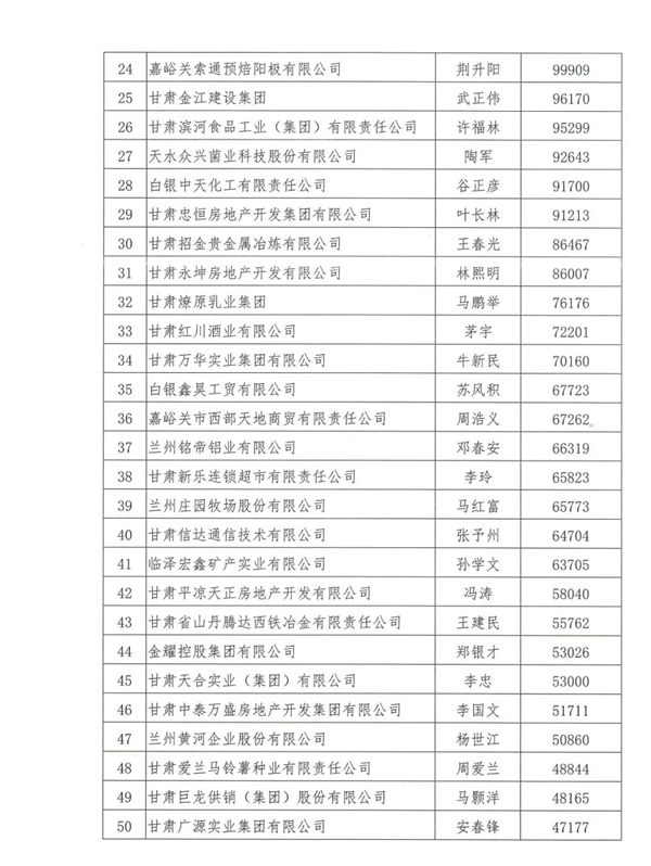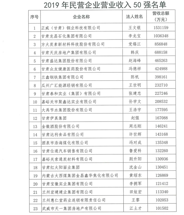 甘肅泰和實業(yè)(集團(tuán))有限公司榮登甘肅省2019年度民營企業(yè)50強(qiáng)榜單