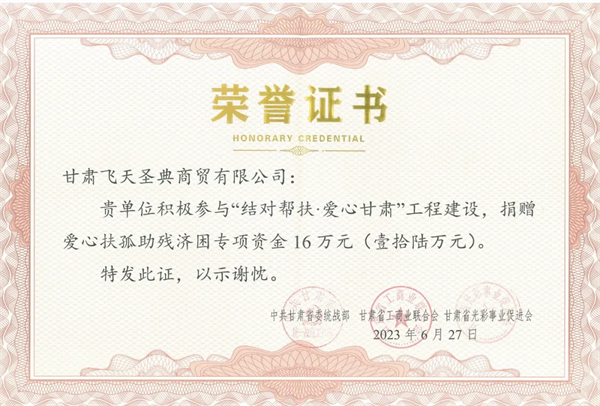 甘肅飛天圣典商貿(mào)有限公司熱衷公益事業(yè),履行社會責任,傳遞公益正能量,積極開展慈善扶貧、助學等活動,用實際行動踐行公益。今后,公司將繼續(xù)在助推鄉(xiāng)村振興、扶危濟困、助學助弱等方面發(fā)揮積極作用,為我省公益事業(yè)發(fā)展貢獻力量。